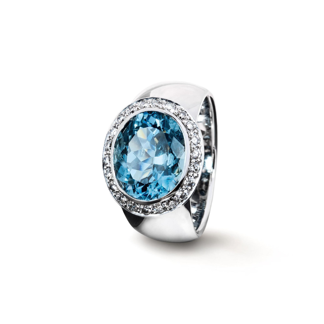 Ref. 12100037 - Excellent von Hand gearbeiteter Ring mit feinem Aquamarin und Brillanten. Den Aquamarin hat seinen Namen von der Farbe des Meeres. Aqua ist in der lateinischen Sprache das Wasser.