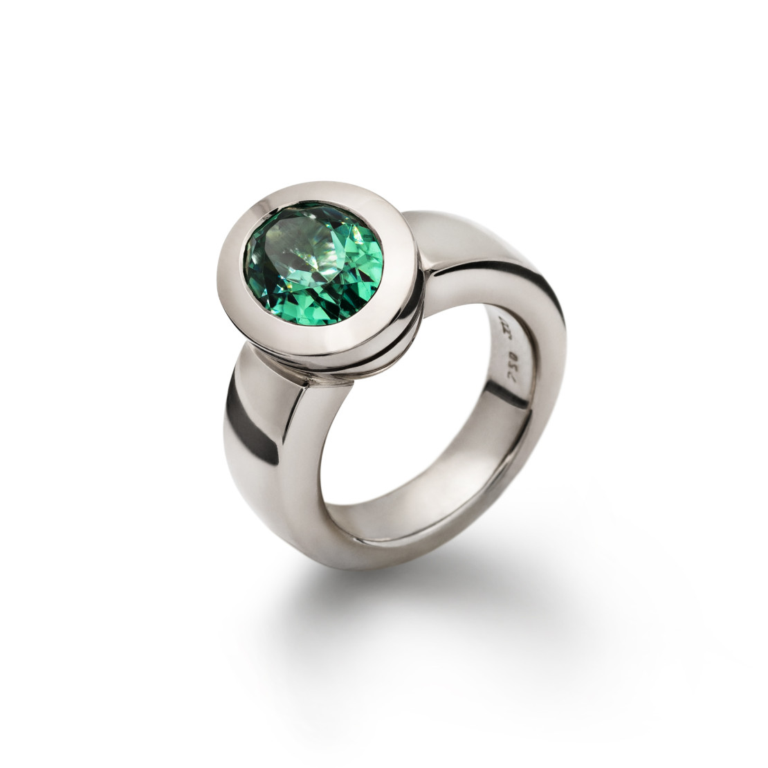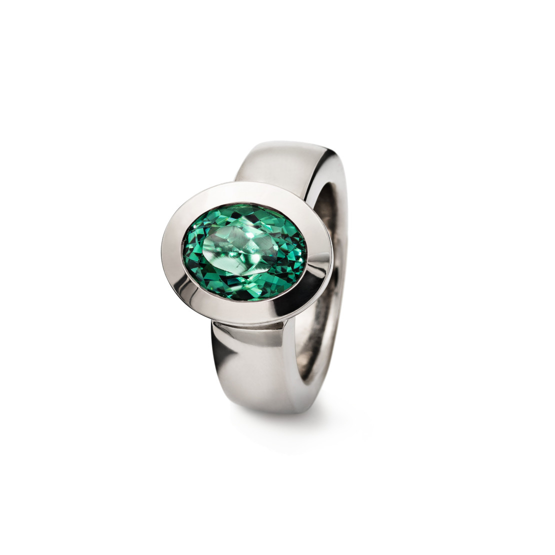 Ref. 121601 - Ein Stück Natur für Ihren Finger: Dieser elegante Ring besticht durch seinen satten grünen Turmalin, der an üppige Wälder erinnert. Die hochwertige Fassung aus 750er Weißgold unterstreicht die natürliche Schönheit des Edelsteins und verleiht dem Ring eine zeitlose Eleganz.