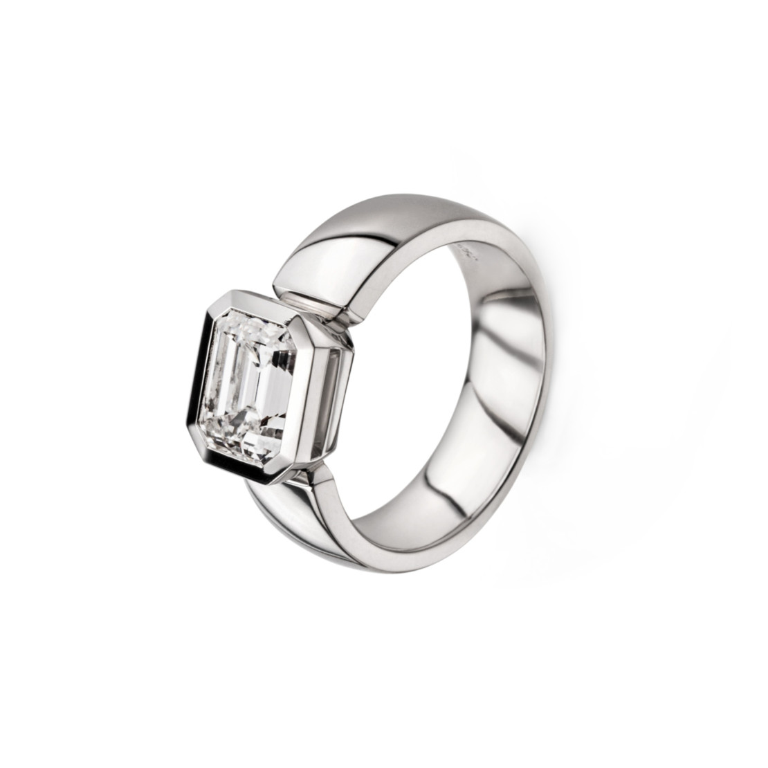 Ref. 121937 - Skulpturaler Solitär mit Haltung. Ein Emerald Cut Diamant von 2,06 Karat in der Qualität F VVS2 sitzt in einer klaren Platinfassung auf einer weich gerundeten Ringschiene. Reduziert, kraftvoll, kompromisslos elegant, ein Unikat aus dem Hause J. C. Osthues für Kennerinnen außergewöhnlicher Steine.
