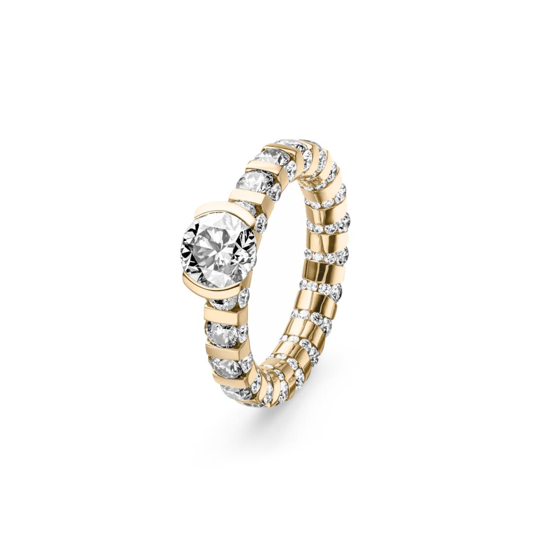 Ref. 48100_R_100_BR_YW - Der Paradoxal ist wahrlich ein glamouröses Schmuckstück, das die Grenzen zwischen Realität und Fantasie verschwimmen lässt. Ein Traum von einem Ring, faszinierend und irritierend schön zugleich, der jeden Betrachter in den Bann zieht, weil man zu sehen glaubt, was eigentlich nicht sein kann: Der ganze Ring scheint nur von Diamanten zusammengehalten zu sein. Ein schillerndes Gesamtkunstwerk, fast zu schön, um wahr zu sein. So wie jede Frau ihren eigenen Kopf und Stil hat und ihre persönlichen Vorlieben in Bezug auf Farben, Formen und Materialien, so unterschiedlich und eigenständig ist das Design eines Paradoxal Rings. Ob mit strahlend weißen Diamanten, extravaganten Fantasiesteinen oder Steinen in natürlichen Braunnuancen, ob mit sanft abgestuften Farbharmonien oder mit lebendigen Farbkontrasten, ob in Weiß-, Rosé- oder Gelbgold, ob schmal oder voluminös geschnitten, ob mit Cut-out oder ohne – es ist Ihr Geschmack, der entscheidet.
