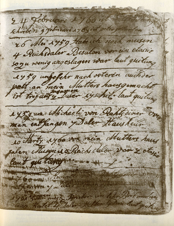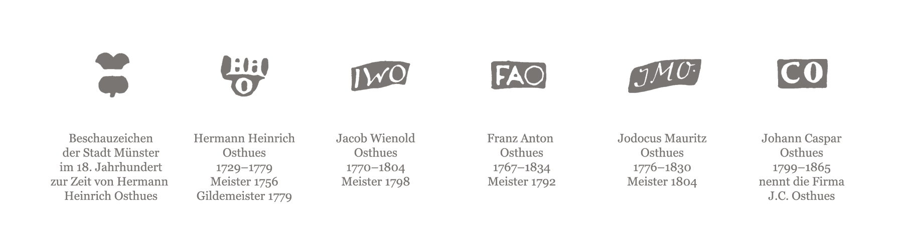 Als Hermann HEINRICH OSTHUES (1729 –1779) im Dezember 1756 seinen Meisterbrief als Goldschmied erhielt, hatte Friedrich der Große wenige Monate zuvor den Siebenjährigen Krieg angezettelt und Wolfgang Amadeus Mozart machte als „Wolferl“ mit knapp einem Jahr die ersten Gehversuche. Hermann Heinrich Osthues arbeitete zunächst am Spiekerhof, dann an der Bergstraße. Zu diesem Zeitpunkt gab es vom münsterschen Schloss nur Pläne und der Erbdrostenhof war gerade mal zwei Jahre alt. Auch die Promenade existierte noch nicht - zum Glück für die Stadt war sie noch von Mauern und Gräben umgeben. Denn nur ein Jahr nach Gründung des Unternehmens Osthues erreichte der Siebenjährige Krieg auch die fürstbischöfliche Residenzstadt Münster. 1759 belagerten dann hannoversche Truppen die Stadt. „1759 Den 3 September des Morgens um Halber 5 uhr Haben die Hanoveraner die stad munster angefangen zu Bomberdiren …“, notierte Hermann Heinrich Osthues in seinem Gesellenbuch. Hier hielt er ab 1758 fest, was im Unternehmen und in der Stadt vorging. Auch die Leistungen der Lehrlinge und Gesellen, Wechselkurse, Einkaufsreisen und Lieferantenkontakte wurden hier von ihm persönlich notiert.